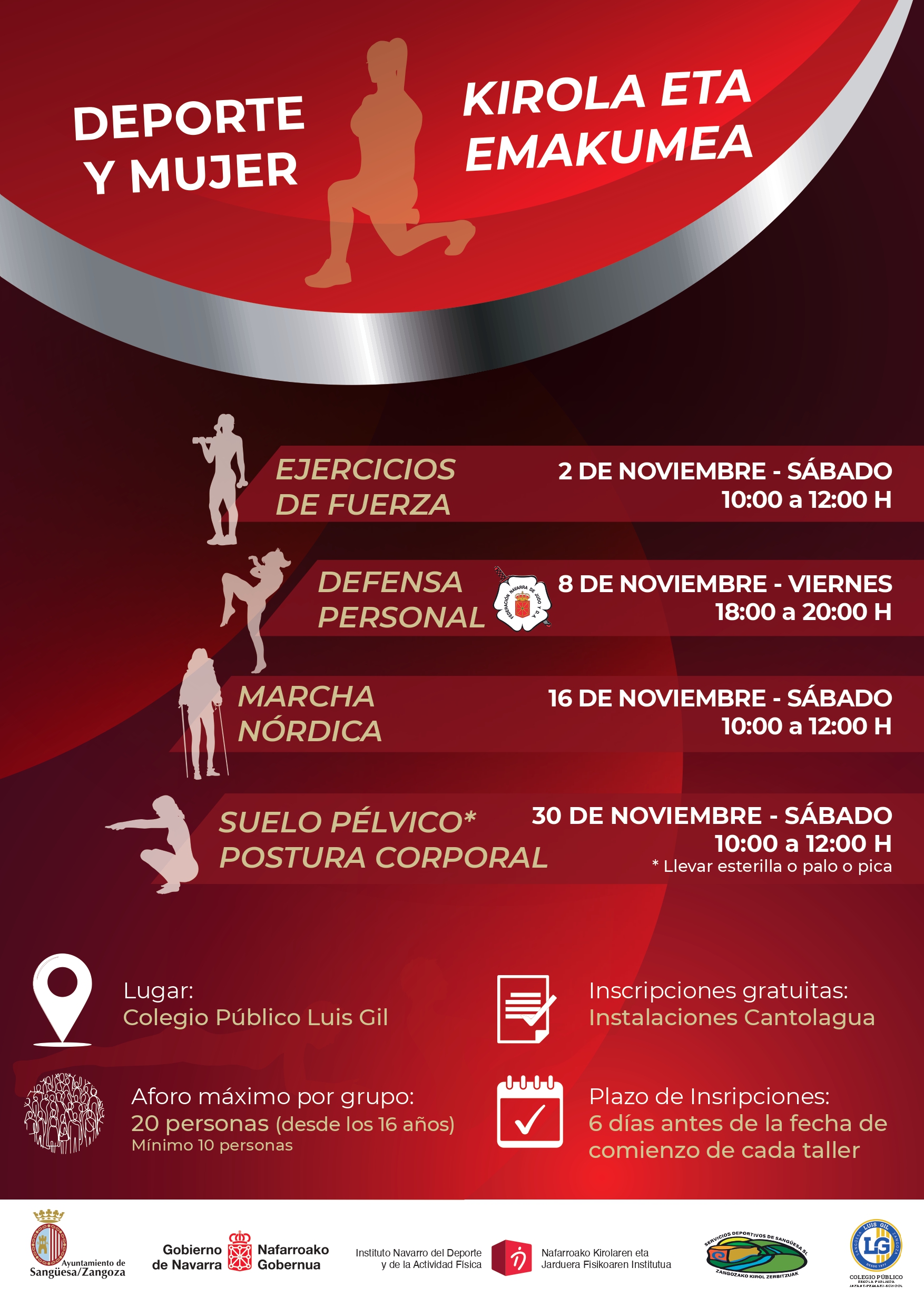 El Instituto Navarro de Deporte y de la Actividad Física (INDAF), dentro del Programa Deporte y Mujeres, asume el compromiso de impulsar la formación ofreciendo diversos talleres de ejercicios de fueraz, defensa personal, marcha nórdica, suelo pélvico y postura corporal en diferentes localidades de la Comunidad Foral de Navarra de manera gratuita.