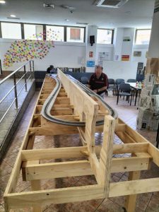 La construcción de esta maqueta, tal como cuentan desde la propia asociación, empieza a coger forma gracias a Jesús Espatolero con su colaboración en la construcción con madera de la base de la maqueta. En enero, gracias a la ayuda de las personas de Convive Sangüesa y la propia Horizonte, comienzan a montar la maqueta en la sede de la asociación. Y todo esto con el apoyo de la Fundación Caja Navarra / Fundación La Caixa.
