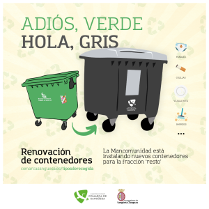 La Mancomunidad de la Comarca de Sangüesa ya ha instalado en nuestra ciudad los primeros nuevos contenedores para la fracción ‘resto’. Son de color gris y sustituyen a los antiguos de color verde. Aquí debes depositar pañales, compresas, colillas, restos de barridos y aspirados, vajilla rota… ¡Y separa los demás residuos! Reduciendo la fracción ‘resto’ evitamos enterrar más residuos en el vertedero.