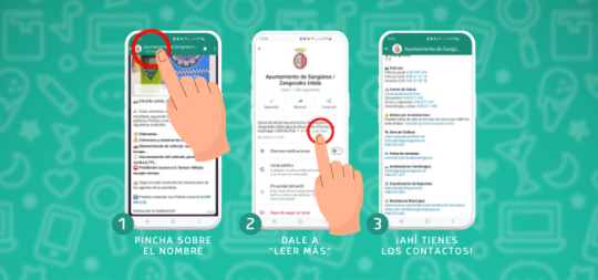 Entrando en el Canal de WhatsApp del Ayuntamiento de Sangüesa, pinchando sobre el nombre del canal se puede acceder a muchos de los contactos de los servicios municipales: of...